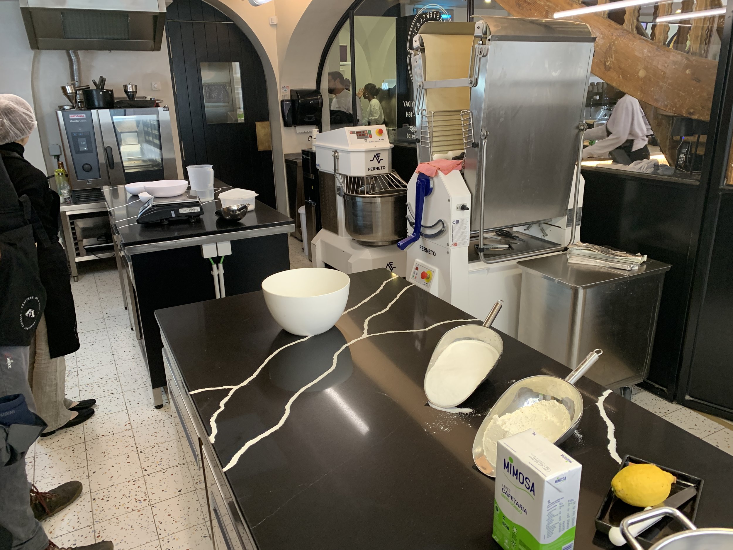 Whereas the class we had witnessed was chock full (I think they take a maximum of 12 in a class), my class had three attendees - Ulrich from Germany, Michi, a pastry chef from Japan and myself. The space is laid out simply with a couple of work tables, all essential tools, a sheeter, mixer, oven etc.