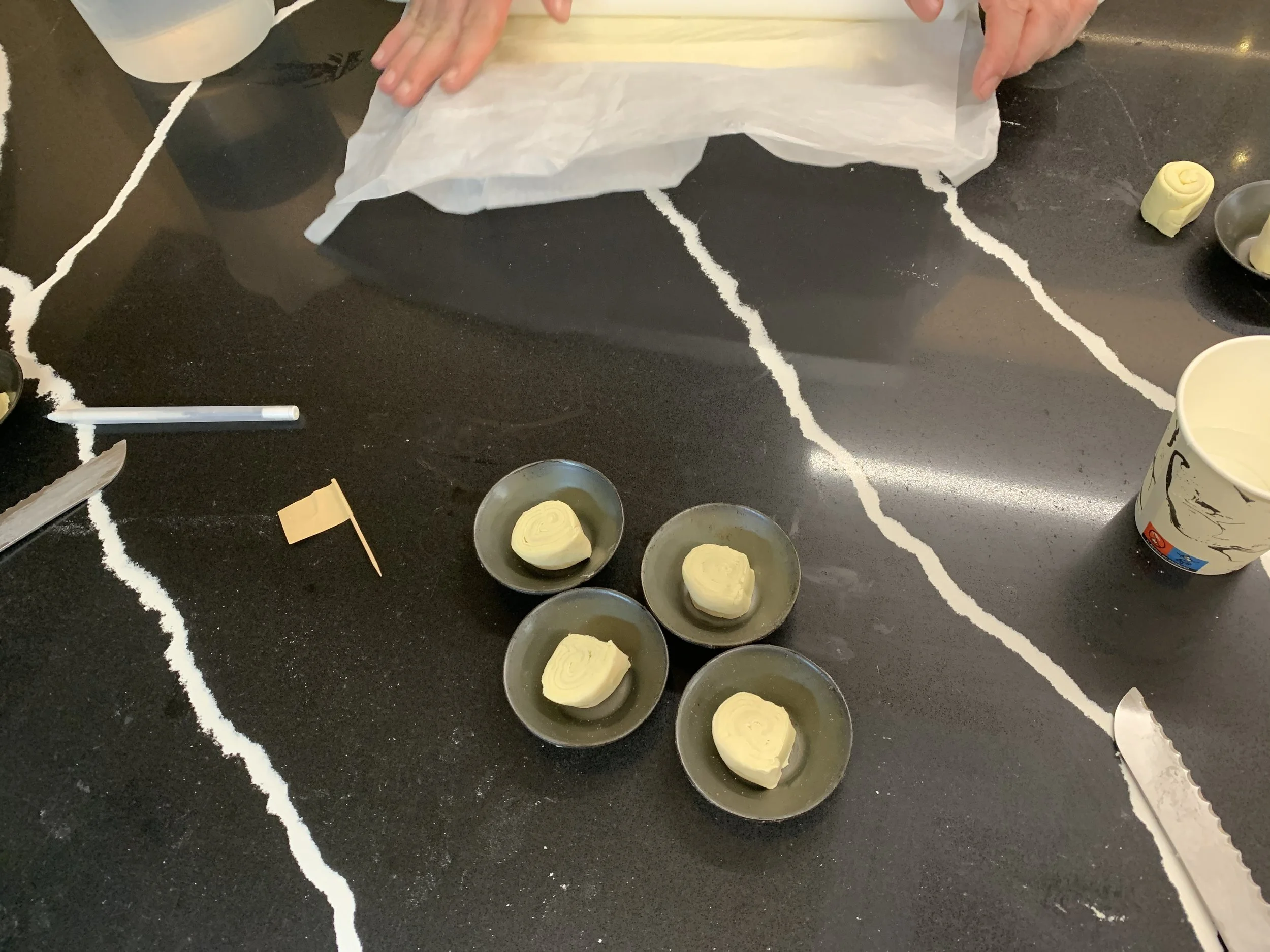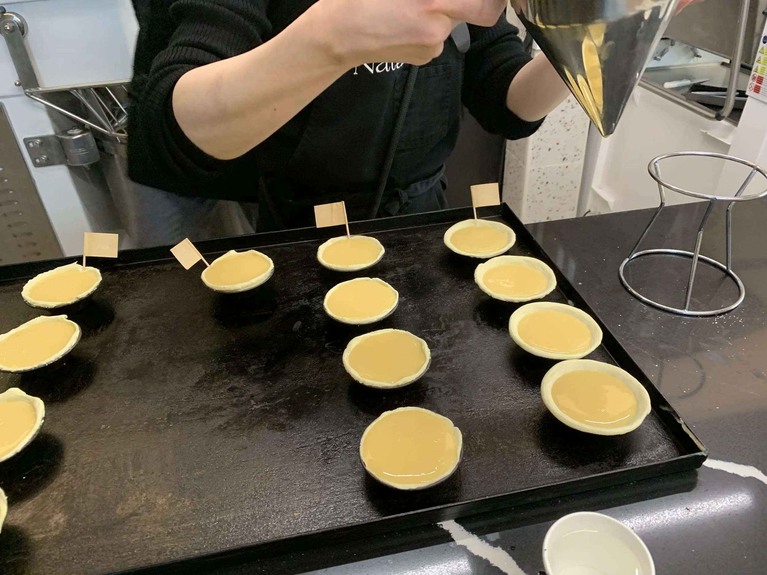 We had made a big batch of custard a little earlier in the class - made with 2% milk, cinnamon stick and some lemon peel first brought to a boil. Reduce heat to low as you add a flour/sugar mixture, stirring constantly to avoid lumps. Then cook over medium heat until thickened a bit (it should leave a trail when lifting the spoon) then set aside to cool to room temperature. Egg yolks shouldn’t go in when the mixture is boiling hot - add the yolks to the base custard mixture right before filling the shells. I’m told this lends itself to a nice silky custard that isn’t too firm or flan like.