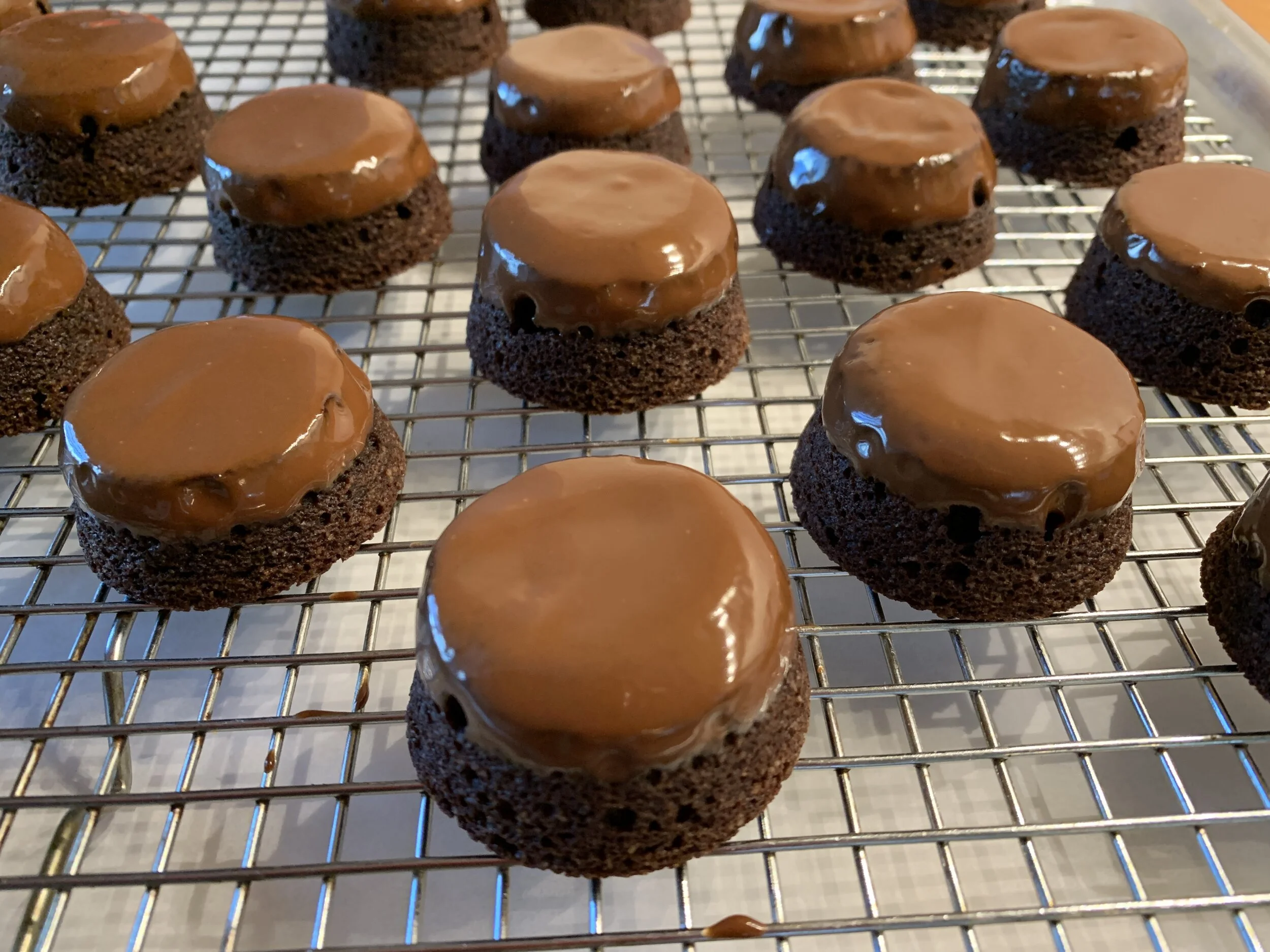 Let them rest about 10 minutes then gently turn them out onto a wire cooling rack. If you can’t wait, try one a bit warm when the chocolate will still be gooey, otherwise cool to room temp and enjoy.