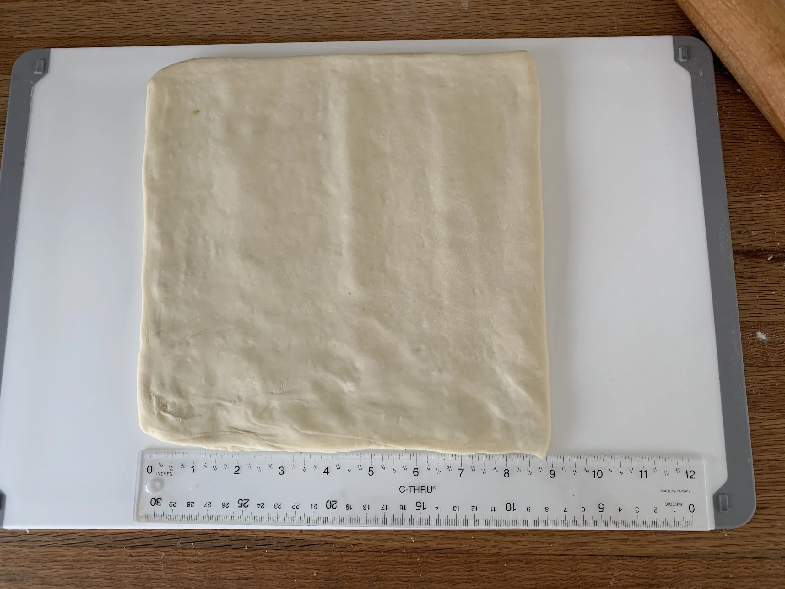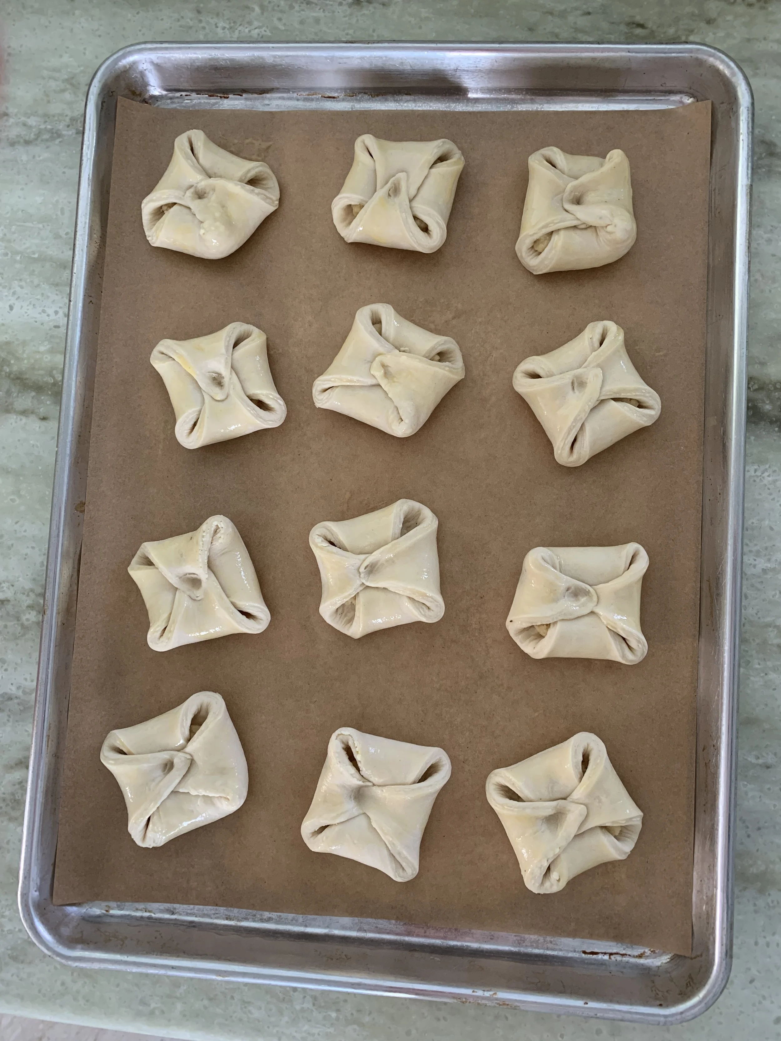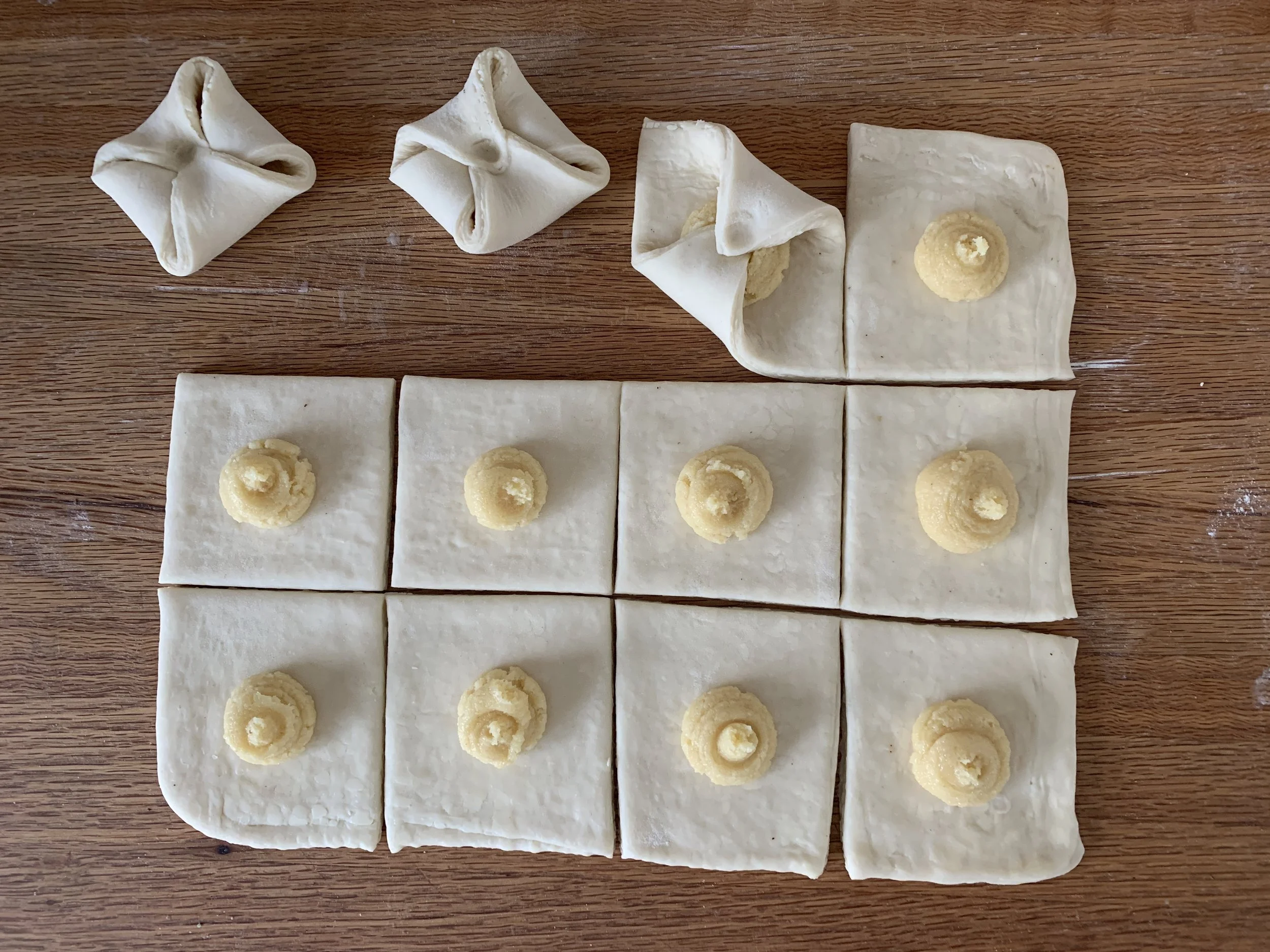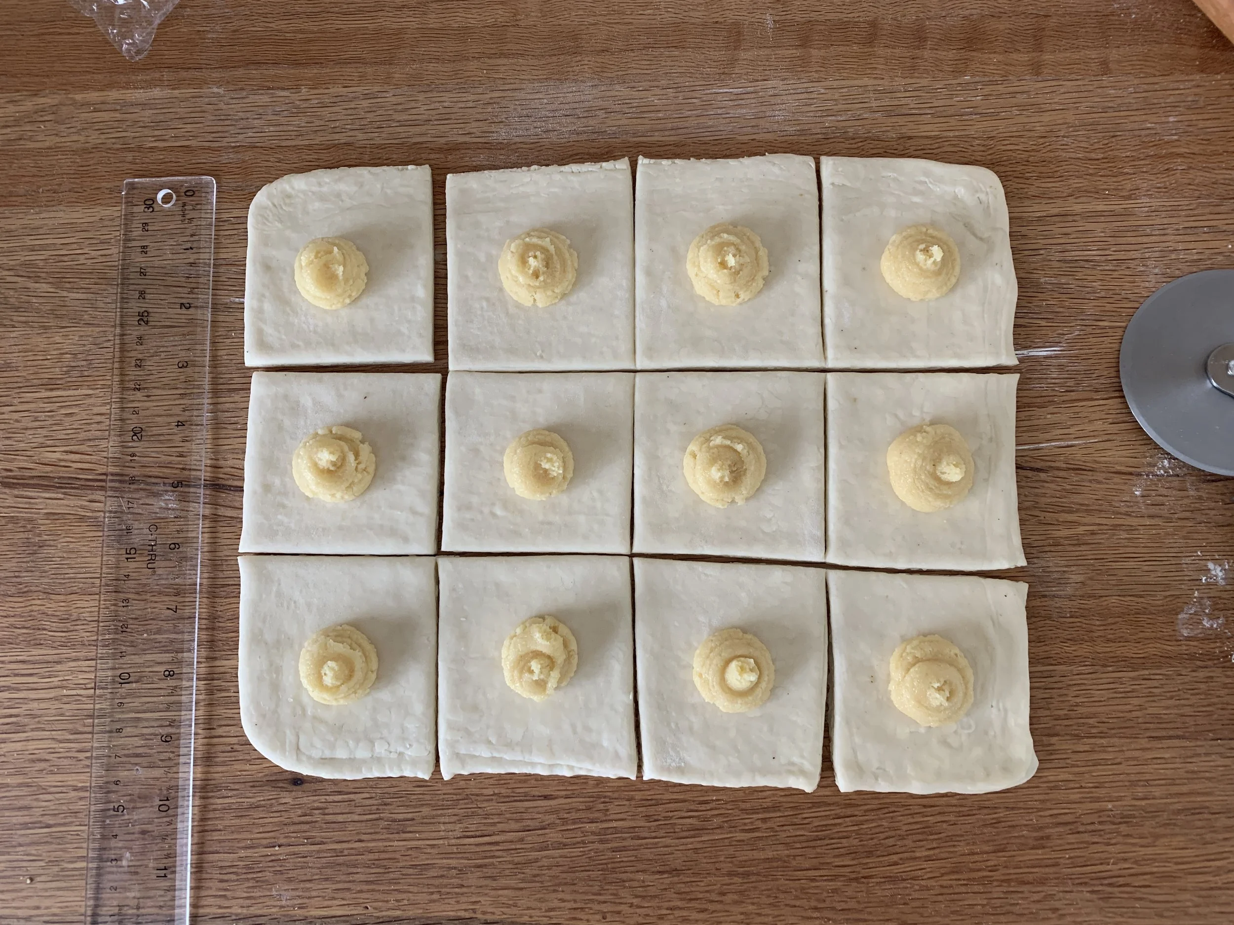 For standard Danish one would typically cut six ~4”x4” squares from a 1/2 portion (rolled out 8”x12”). To yield 12 smaller pastries I rolled the dough out to 9”x12”, cutting 3”x3” squares as seen below.