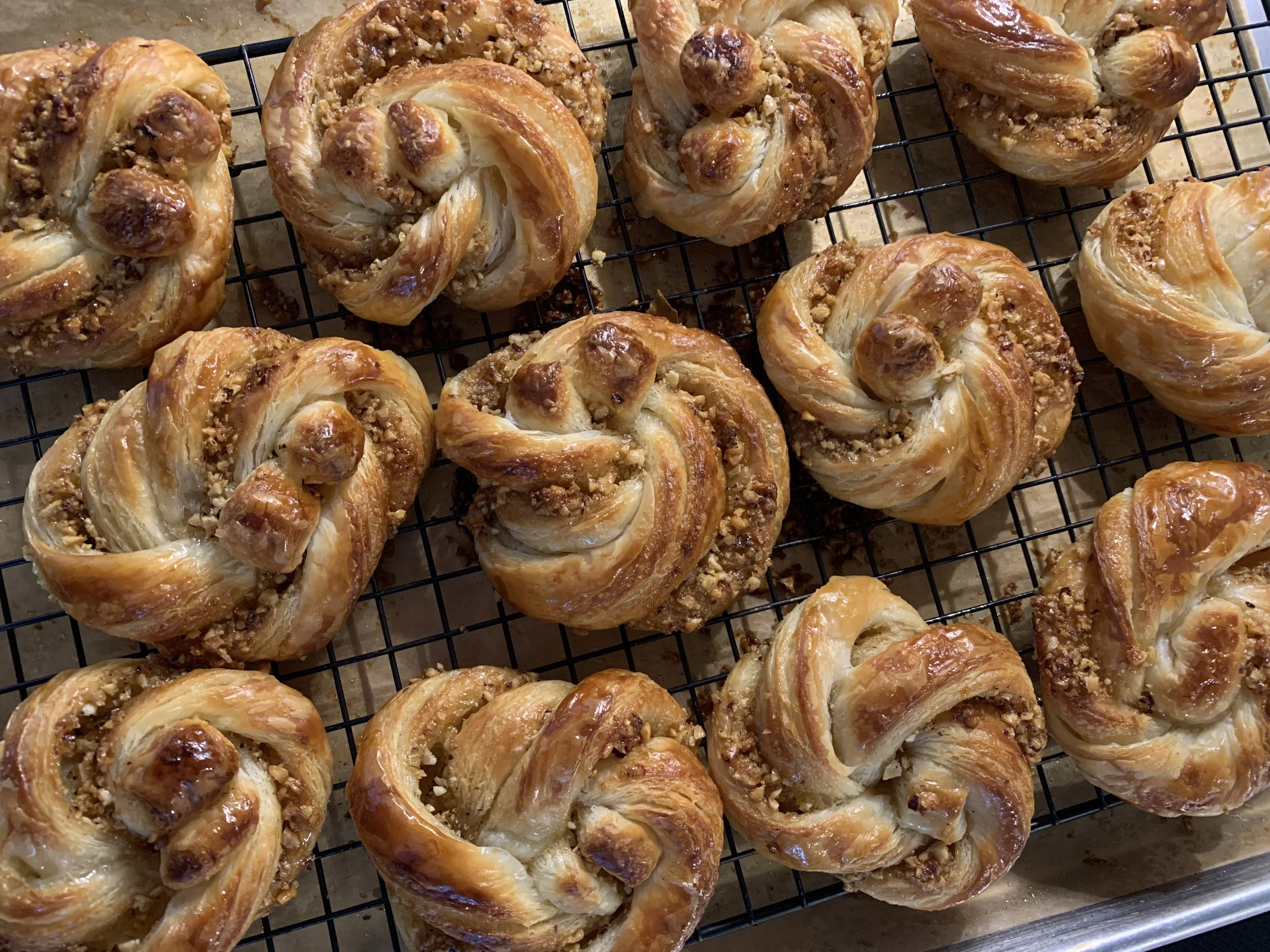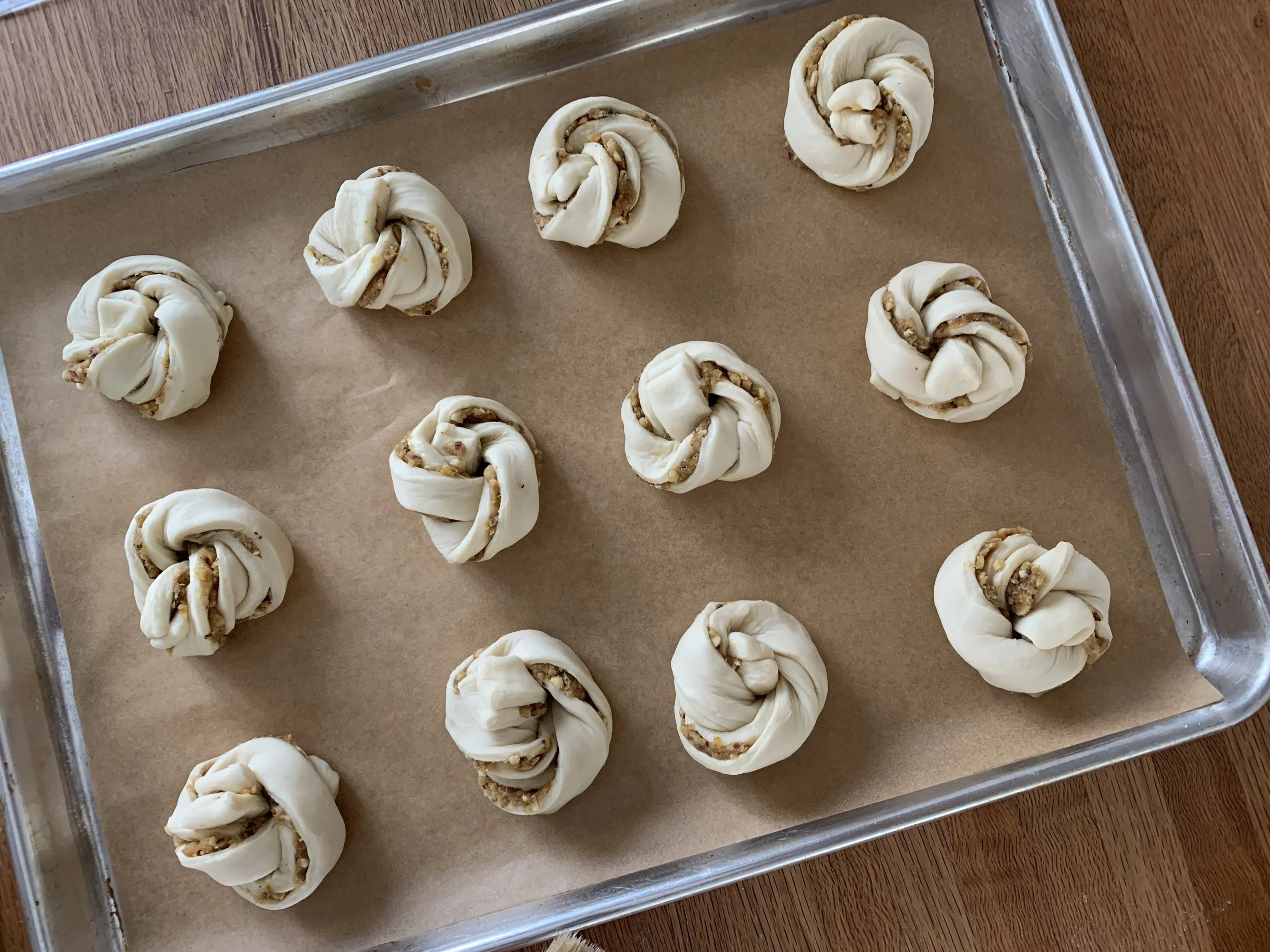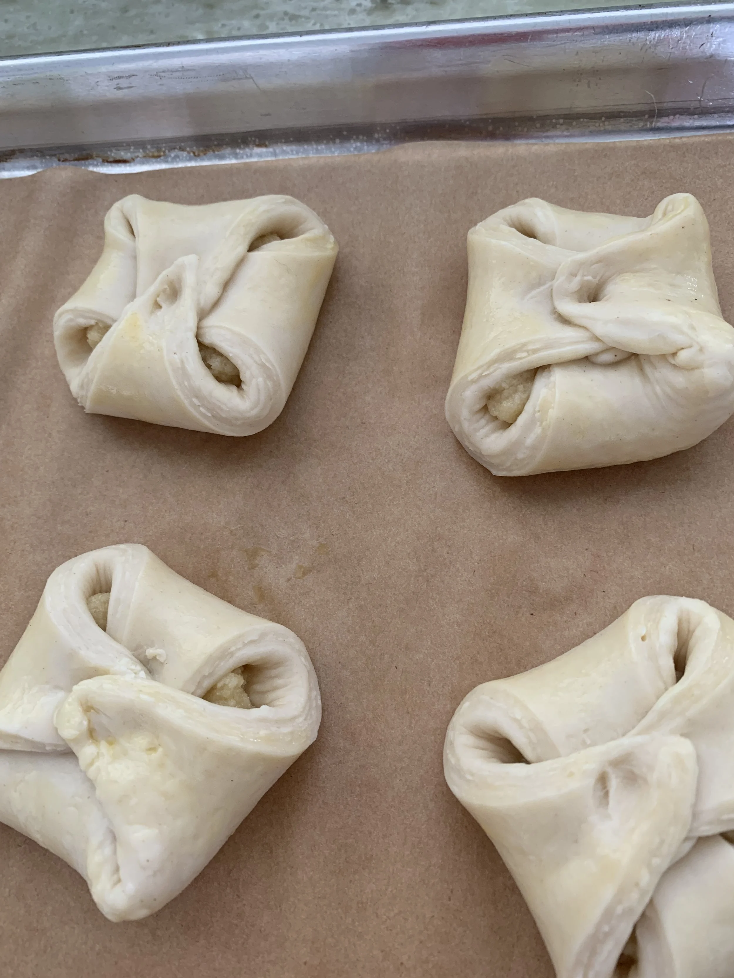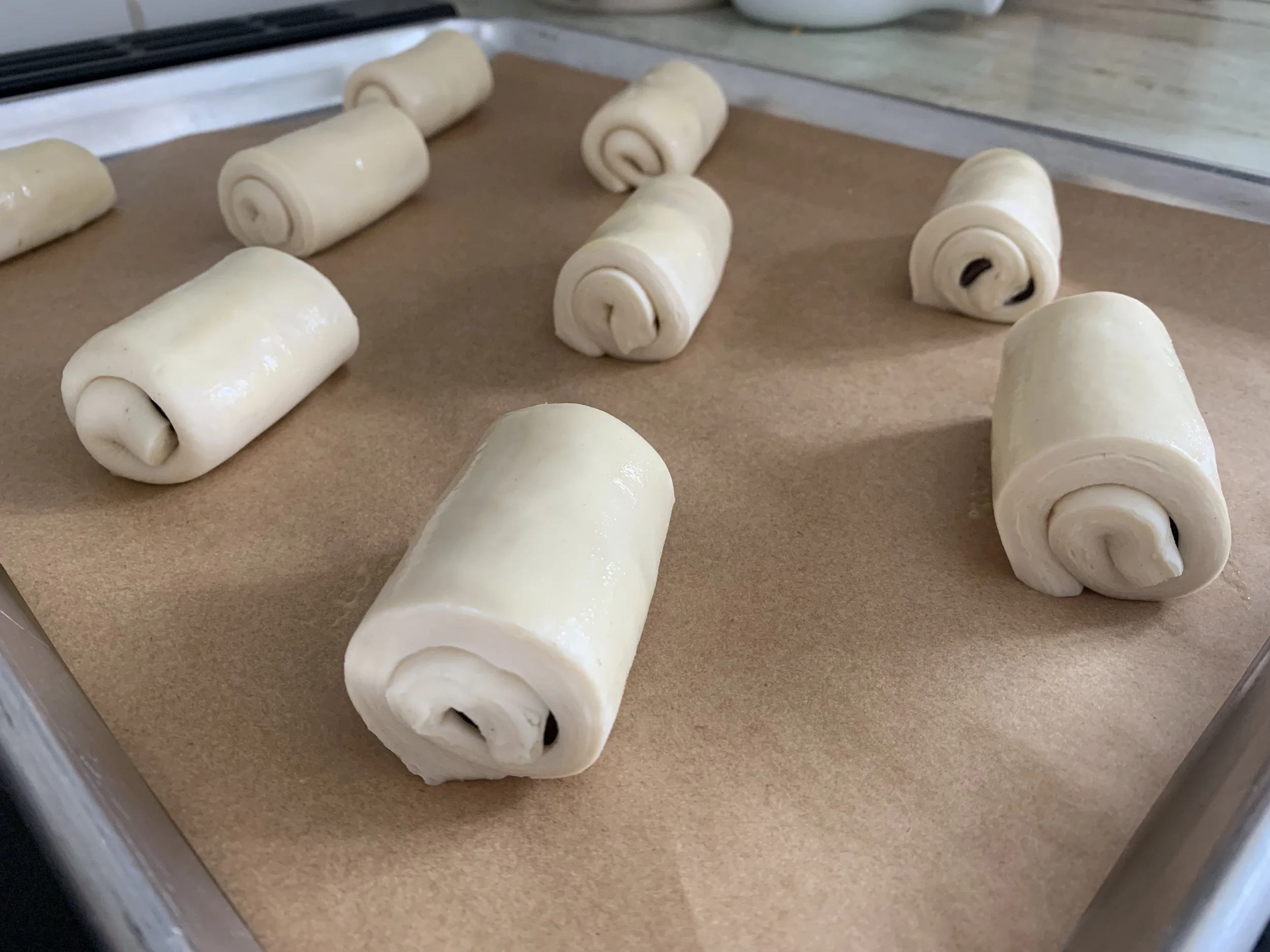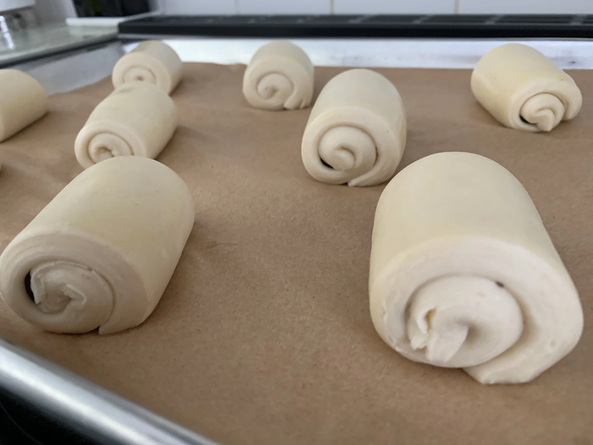 It’s important that the visible cut end of the formed roll be face down on the sheet pan - enough to keep the pastry from rolling open during baking. Don’t worry - it does happen, but they still taste good!