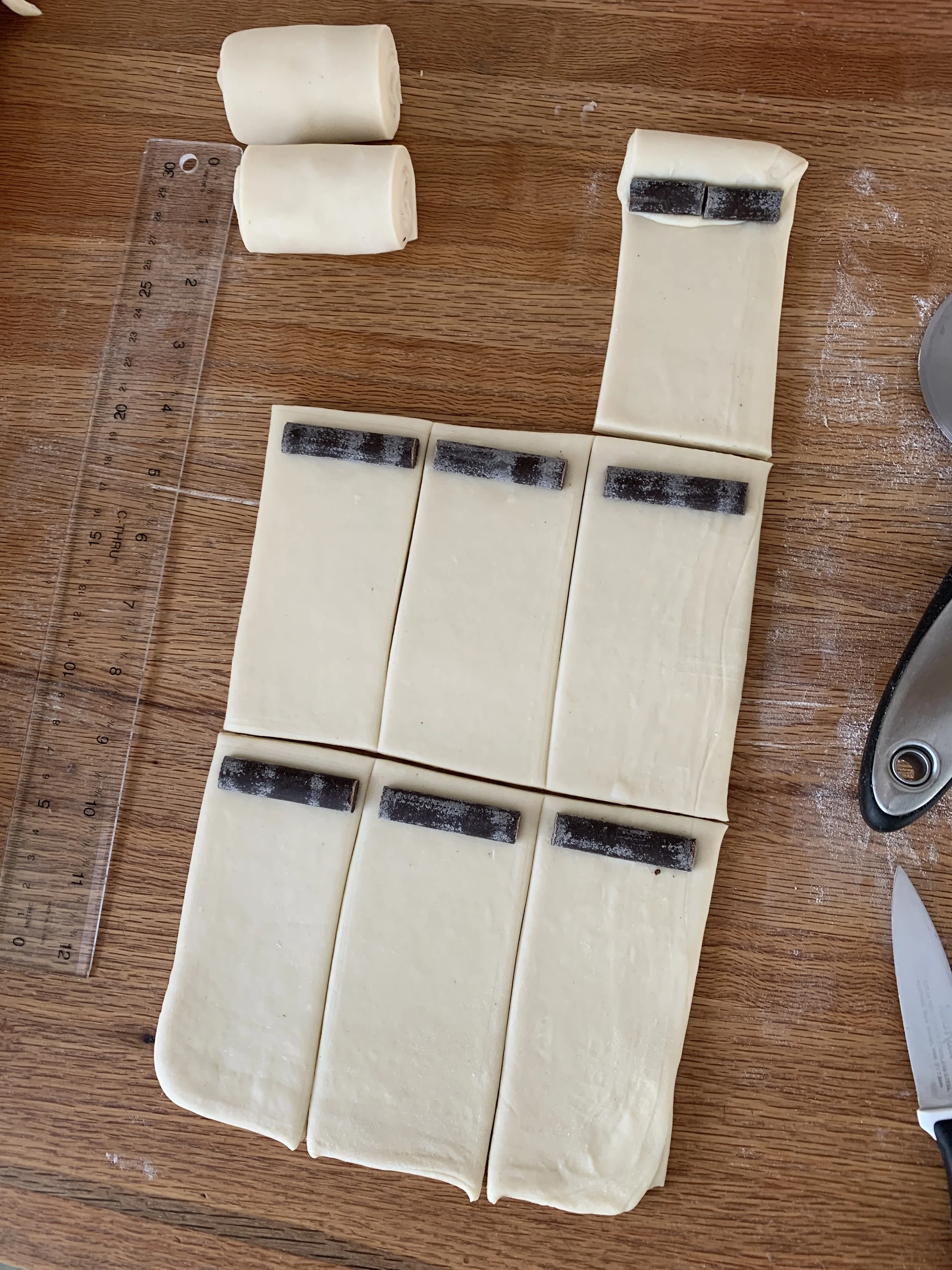 For each pastry rectangle you want enough length of 4.5 to 5” to form a decent log. Place one baton piece across one end, just in a bit from the edge. Roll that edge over the baton then place the second baton (or pieces placed together) tucked up against the dough/first baton. Get it? Then roll it up into a snug log.