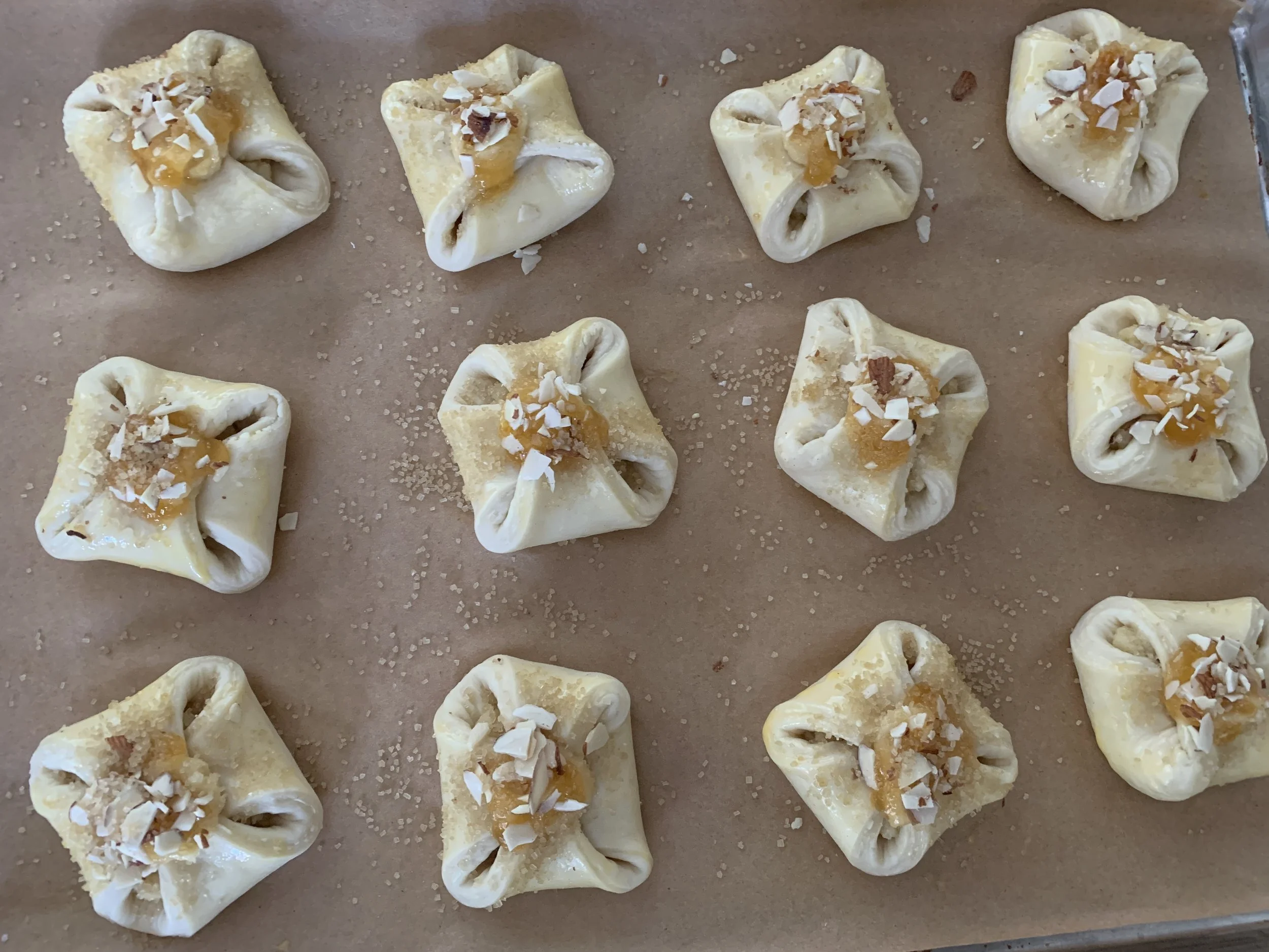 Top them with an additional dollop of crème d’amande, some apricot jam, crushed almond slices and a sprinkle of raw sugar. Give them a second egg wash.