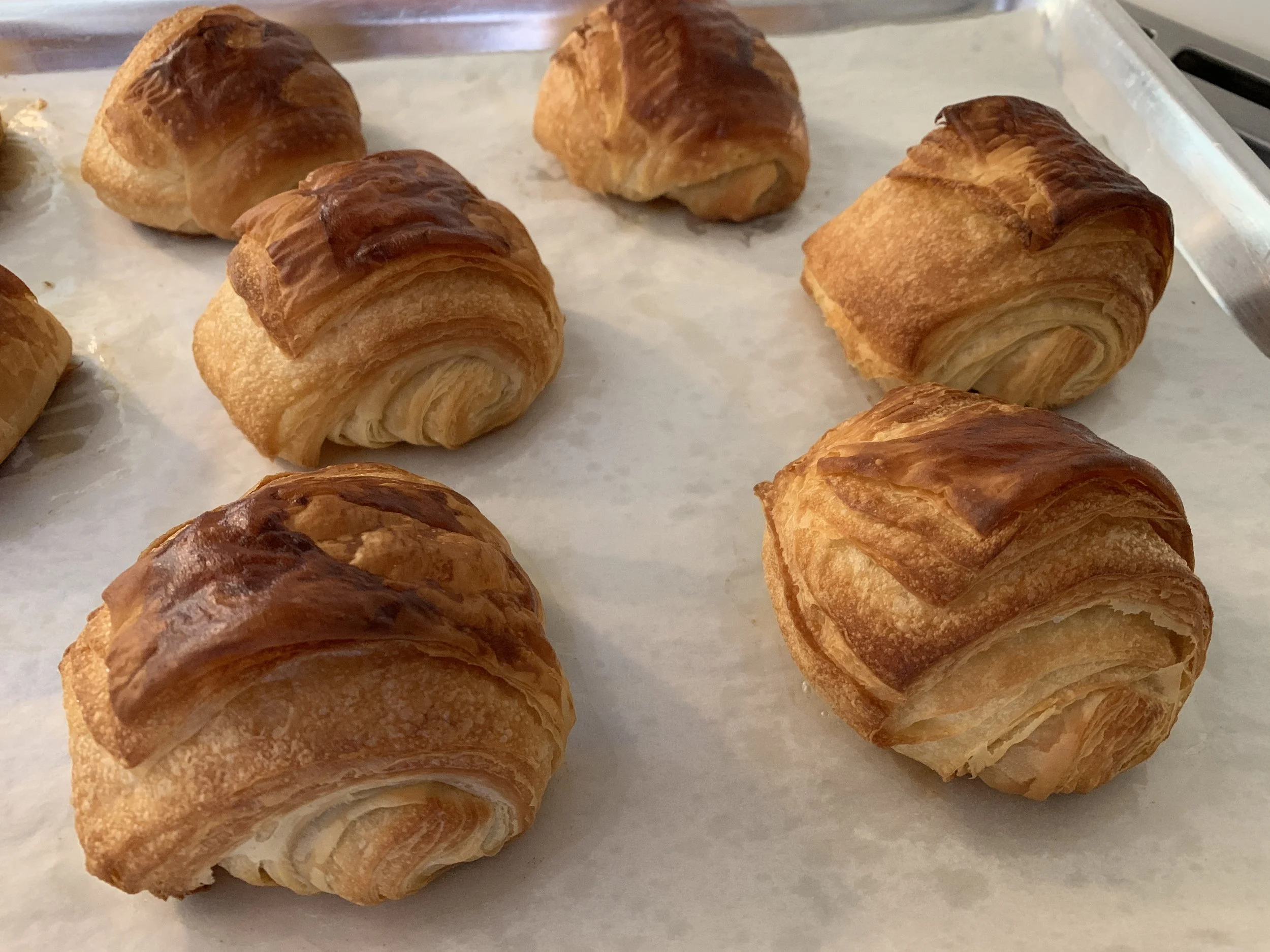 Here’s my standard croissant dough recipe. For those of you familiar with the process, I’ve been playing around with the folding steps. I was taught in pastry school (whoa - going on 20 years ago!) that croissant dough is put through three 3-folds (also referred to as business letter folds). For awhile now I’ve been doing a 4-fold (or book fold) and a 3-fold and calling it good. But lately I’ve added a 2-fold at the end of that process. I like the way the layers come out. Don’t be afraid to play around with it.