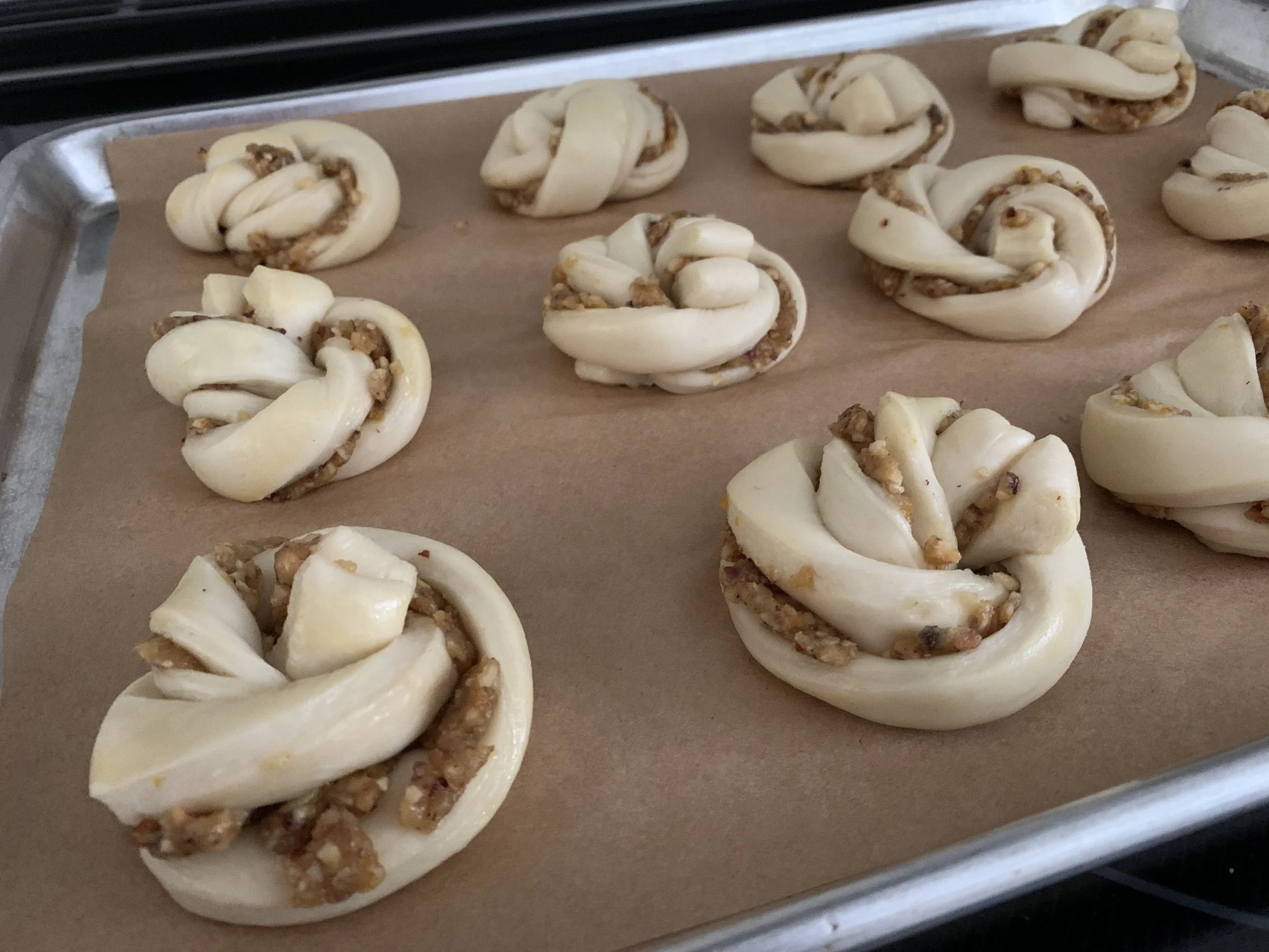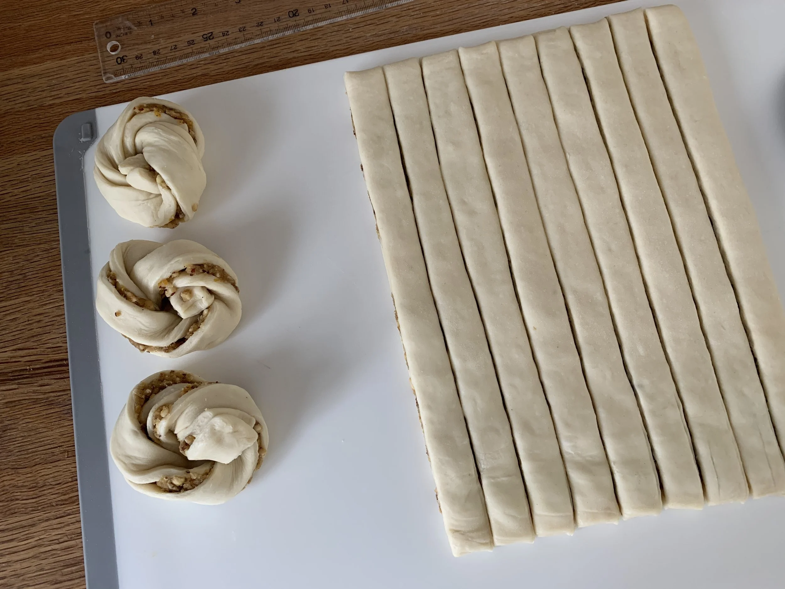 I wanted a yield of 12 pastries so I cut 3/4” strips and twisted and knotted each. Every time I do this it comes out a bit differently. Play around with it.