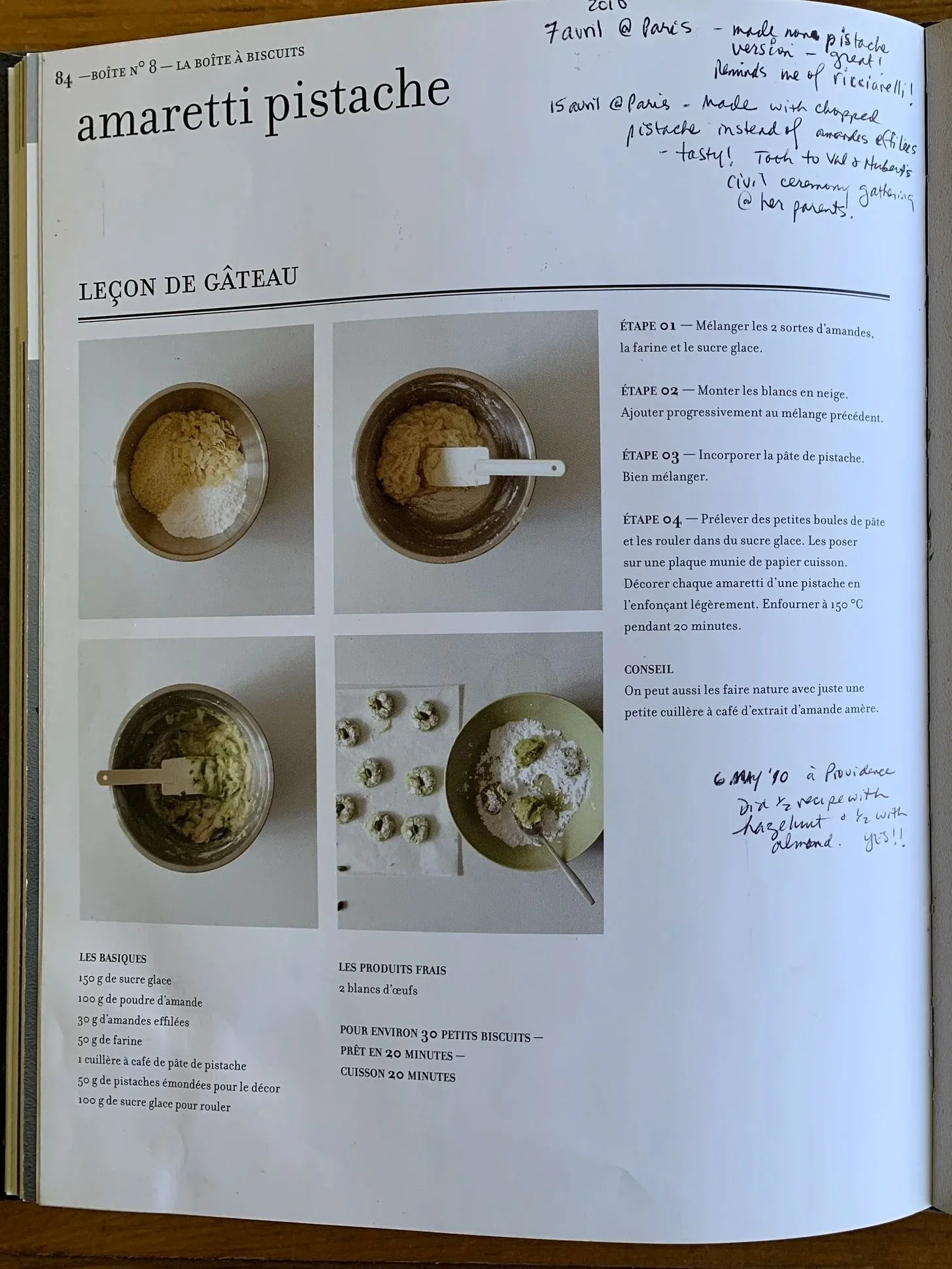 My notes on a number of the recipes I tested indicate that I had made these pistachio amaretti (as well as the box to contain them) to take along to a celebration at Val’s parents’ home after the civil ceremony. Even though the book is in French, the amaretti are truly Italian in nature.