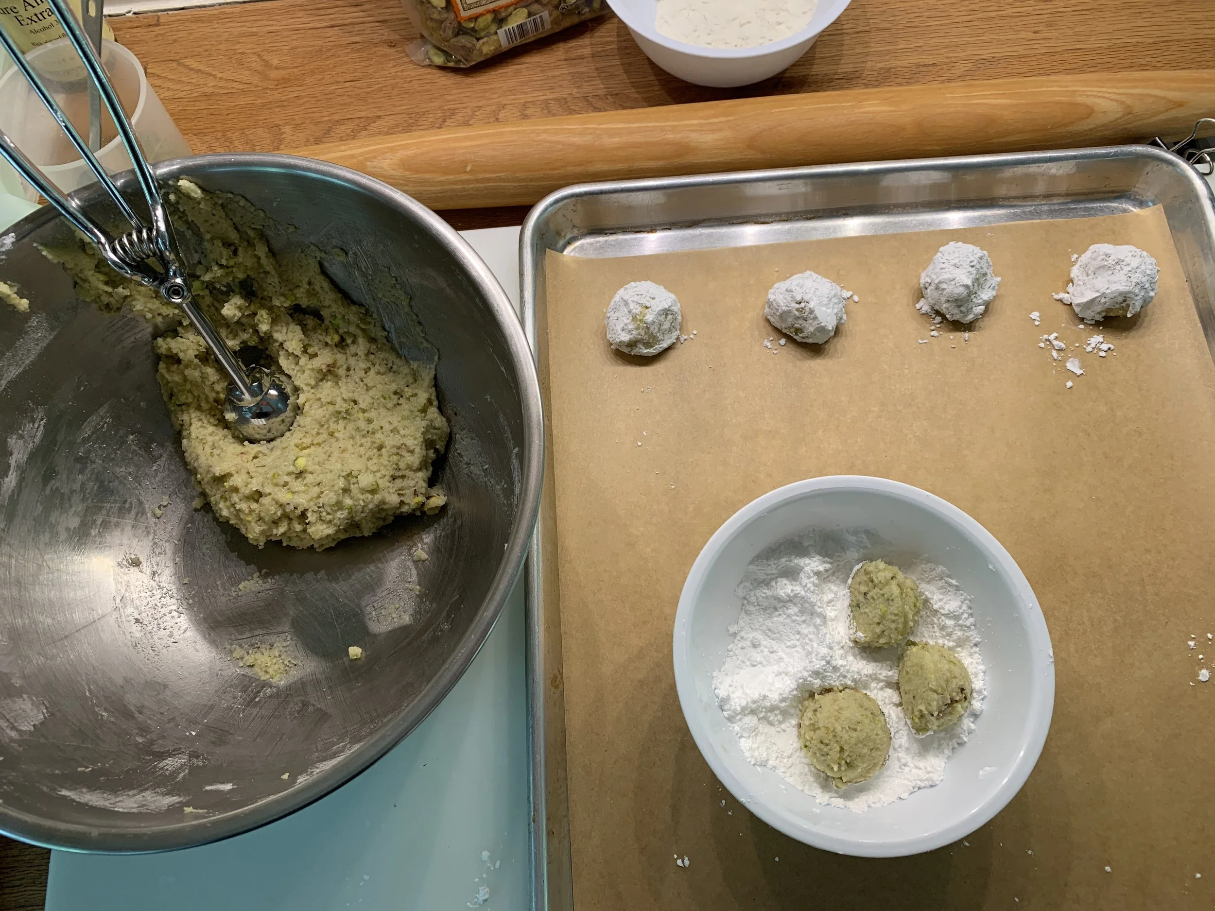 Scoop small boules onto a parchment lined sheet pan - I use a tablespoon sized scoop - and roll in additional confectioner’s sugar. Yield should be around 25-30 small cookies.